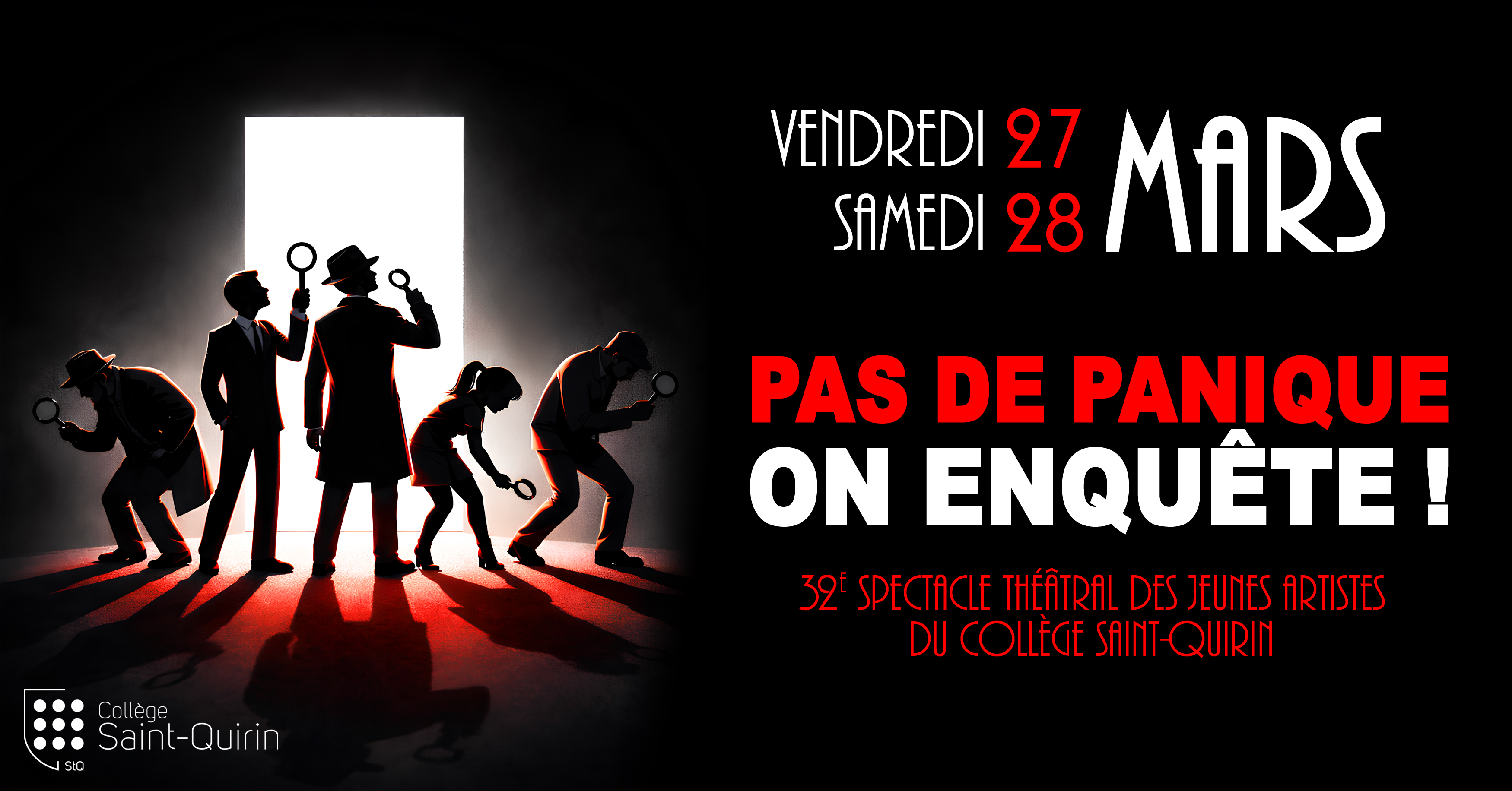Le dernier week-end de mars, les projecteurs éclairent des mystères : quatre enquêtes, des suspects… Le crime monte sur scène ! Mais « PAS DE PANIQUE, ON ENQUÊTE ! »